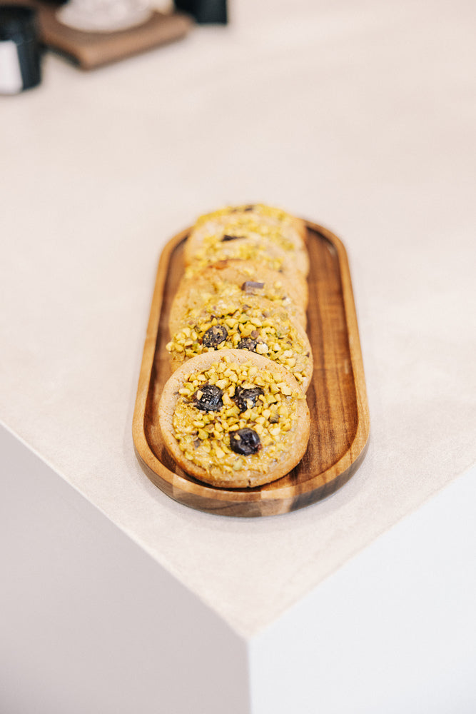 Un cookie généreux au bon goût de beurre, parsemé d’éclats de pistache croquants et de morceaux de chocolat noir intense. Croustillant à l’extérieur, fondant à cœur une douceur réconfortante idéale avec un café ou un matcha latte.