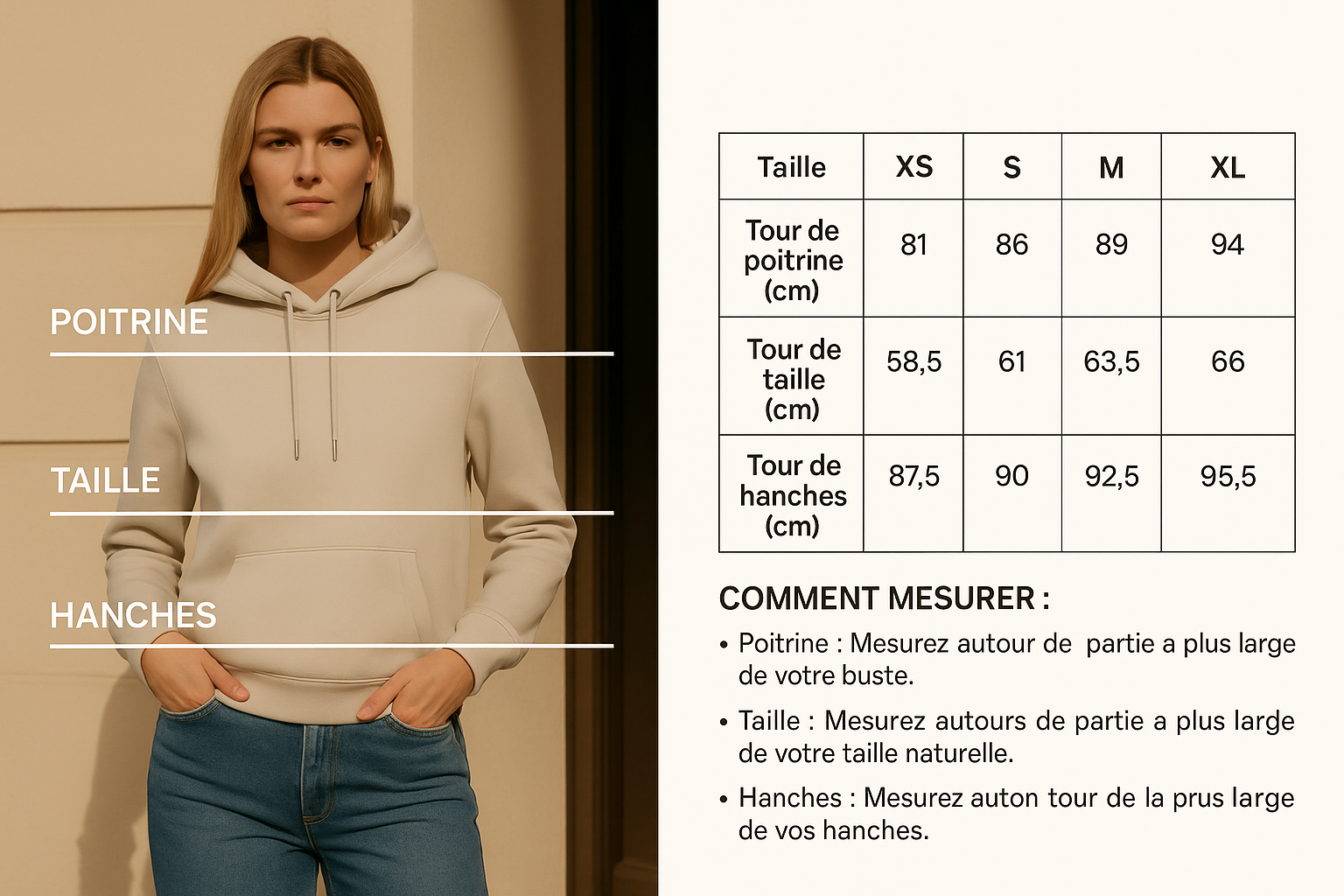 Pour un look oversize et confortable, nous vous recommandons de choisir une taille au-dessus de votre taille habituelle.